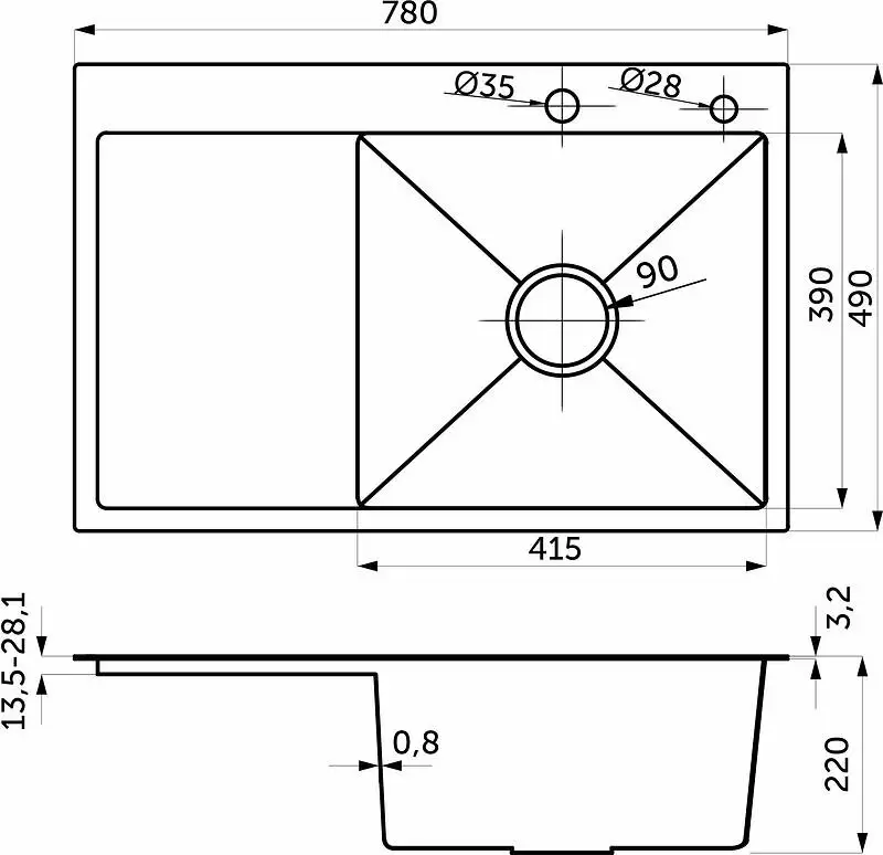 Толщина стали на отбортовке 3,2 мм., толщина стали в чаше 0,8 мм.