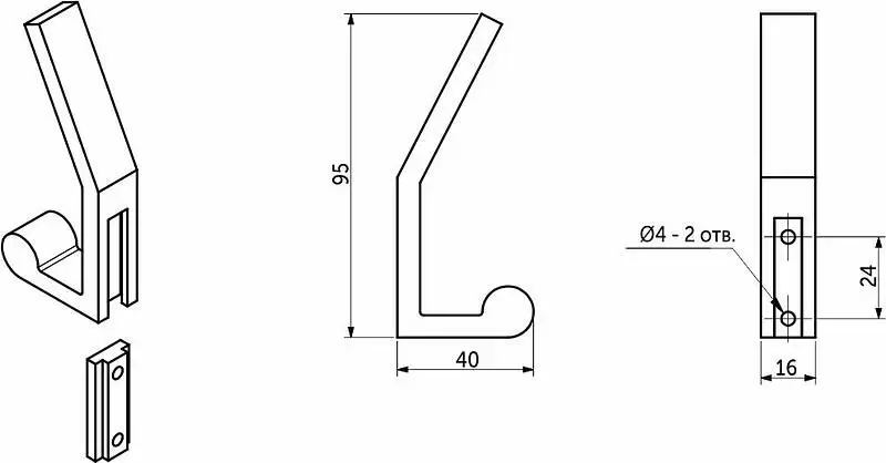 Высота 95мм, ширина 40мм, длина 16мм, расстояние между отверстиями 24мм, диаметр отверстия 4мм.