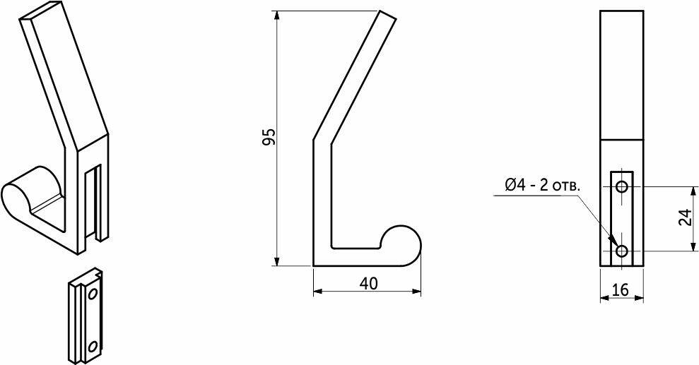 Высота 95мм, ширина 40мм, длина 16мм, расстояние между отверстиями 24мм, диаметр отверстия 4мм.