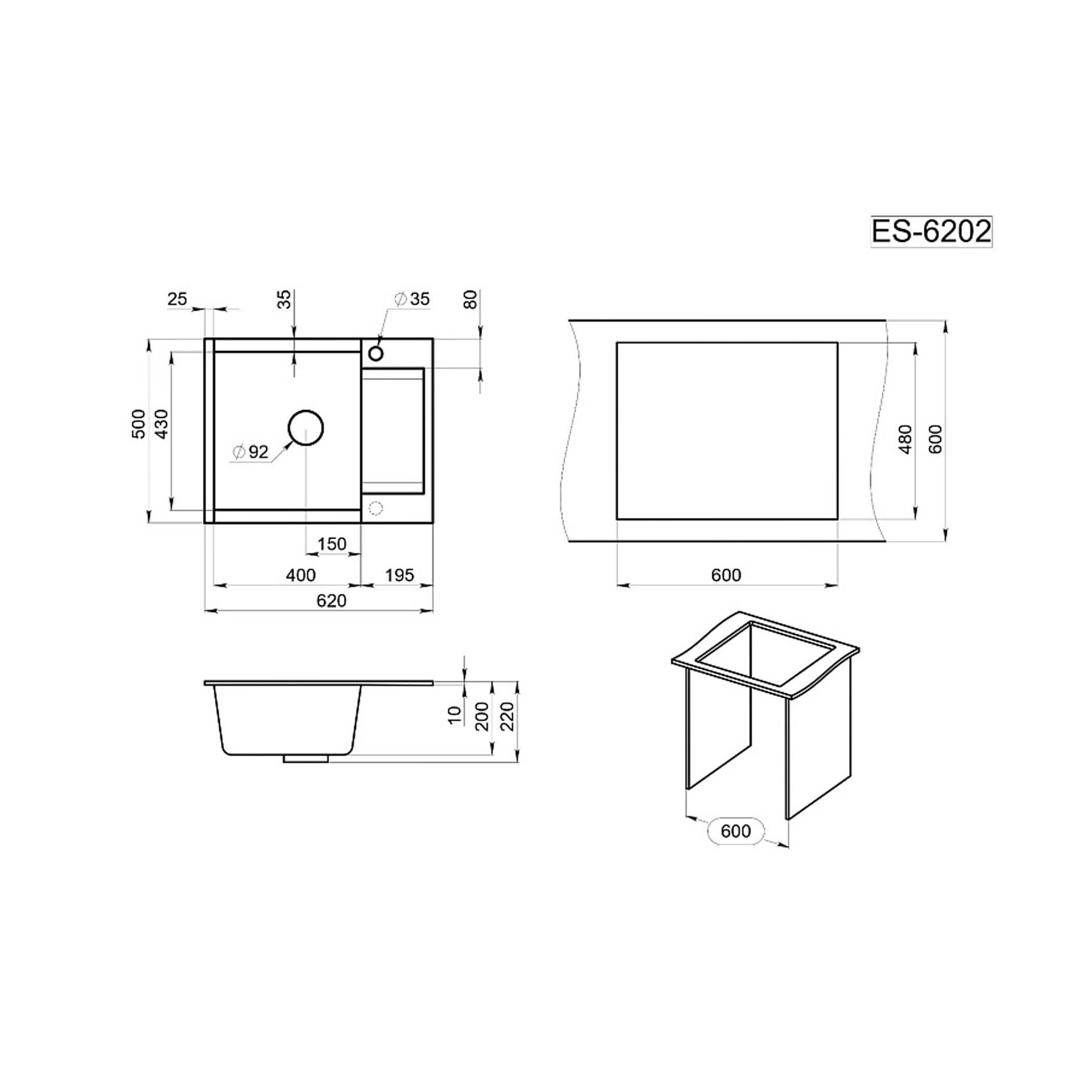 Мойка кварцевая, прямоугольная, GR-6202 Estetica, 620*500мм, графит, Granula