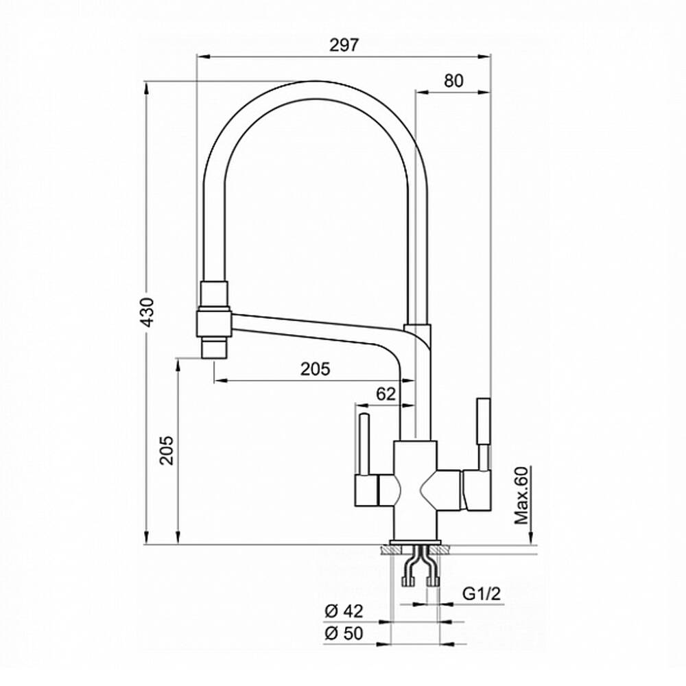 Вращается на 360°. Выполнен из прочной латуни и подходит ко всем видам моек. Имеет высокий гибкий излив и двухрычажную систему с краном для фильтрованной воды.