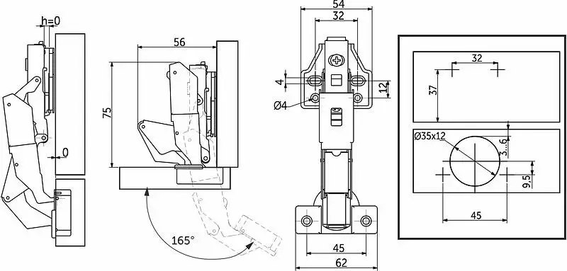 Петля угловая с градусом открывания 165, с нулевым вхождением вхождением специально предназначена для шкафов с высокими внутренними ящиками и выдвижными полками. Таким образом, ящики выдвигаются не задевая дверцы. Высота ответной планки - 0 мм. Межцентровое расстояние крепления чашки - 45 мм.