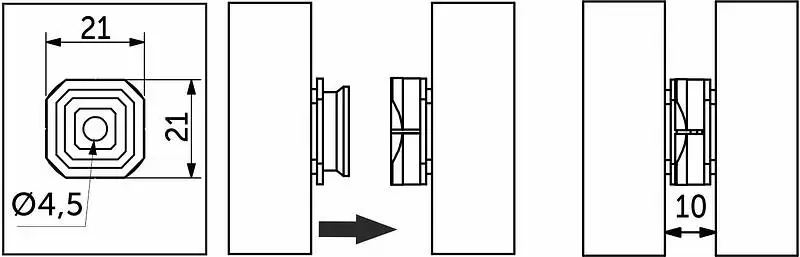 Данные кондукторы при нажатии оставляют отметку для места крепления наружного соединителя на внутренней части устанавливаемой панели. Кнопочные соединители панелей монтируются с помощью саморезов соответствующей длины (по центру крепления находится монтажное отверстие диаметром 5 мм), либо могут фиксироваться к поверхности с помощью клея.