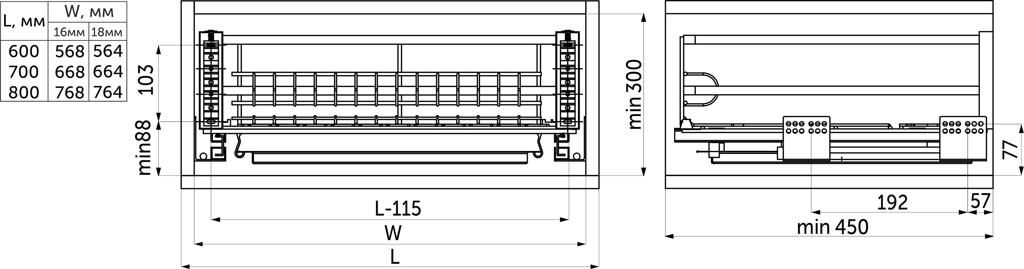 - для фасадов шириной 600 / 700 / 800 мм, рекомендованная высота фасада до 400 мм.