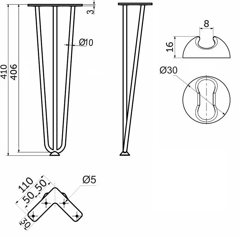 Стильная опора для столов FLASH изготовлена из пруткового металла d10 мм. Материал - сталь. Подпятник съемный, нерегулируемый.