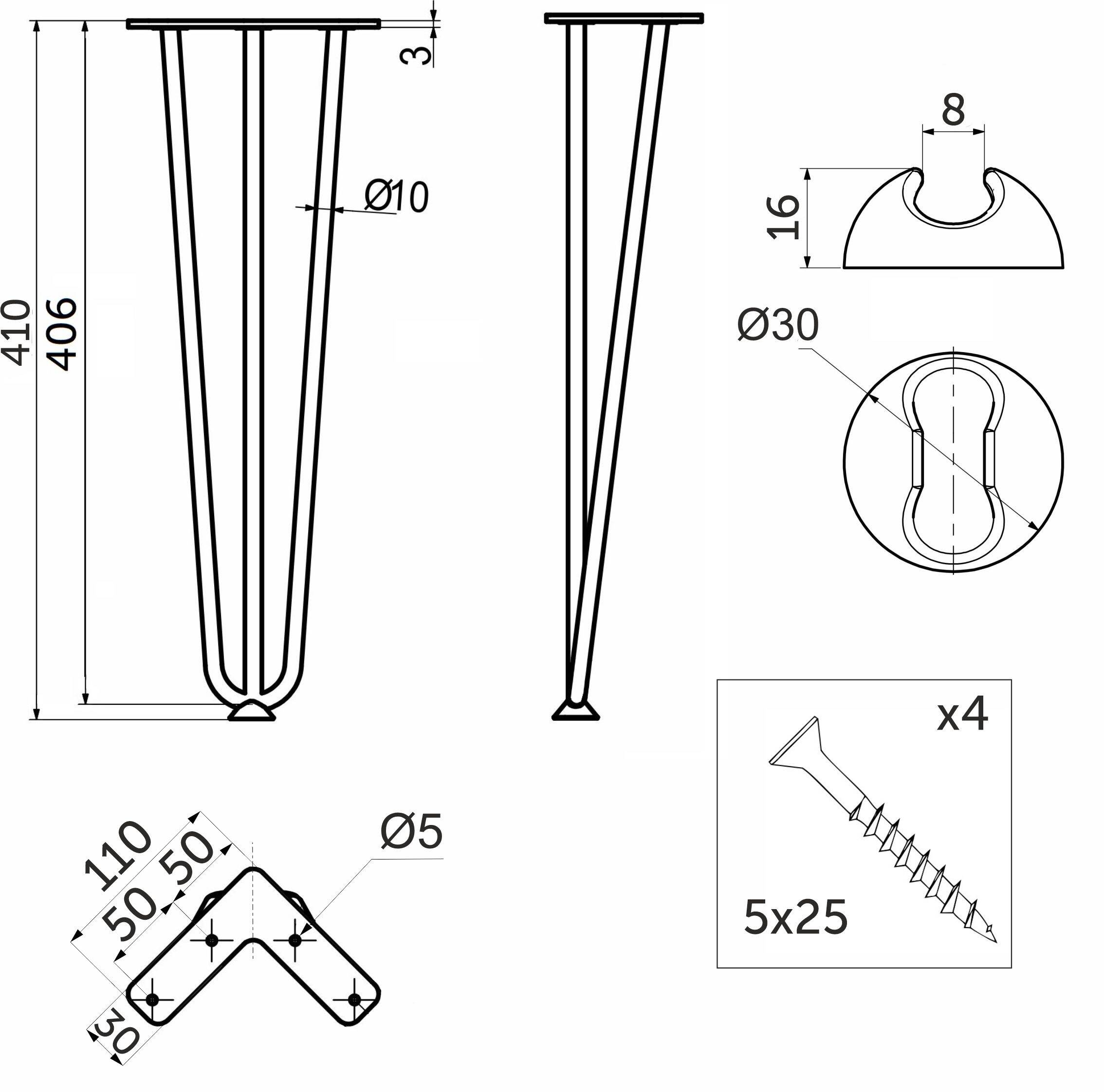 Стильная опора для столов FLASH изготовлена из пруткового металла d10 мм. Материал - сталь. Подпятник съемный, нерегулируемый.
