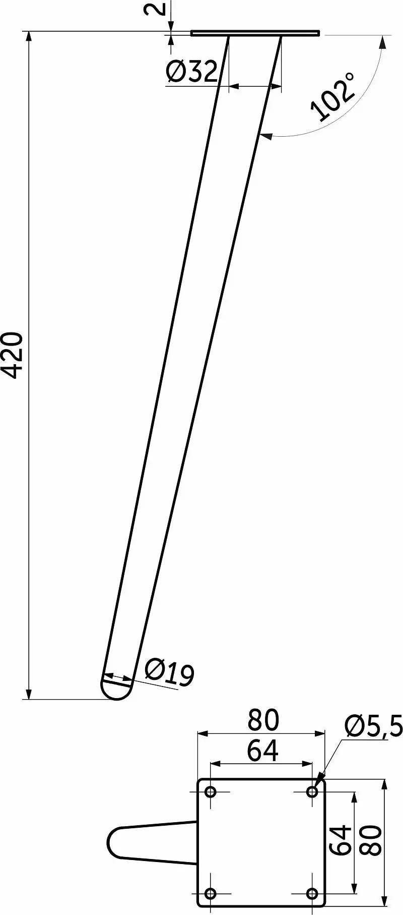 Опора металлическая наклонная для журнальных столиков. Рекомендованная нагрузка на 4 опоры 125 кг. Высота опоры 420мм, размер площадки для крепления к столешнице 80мм*80мм.