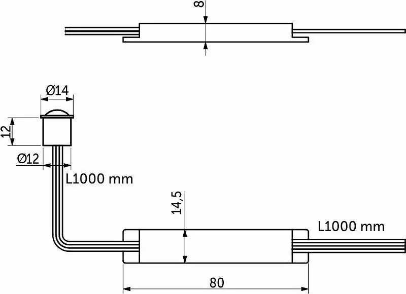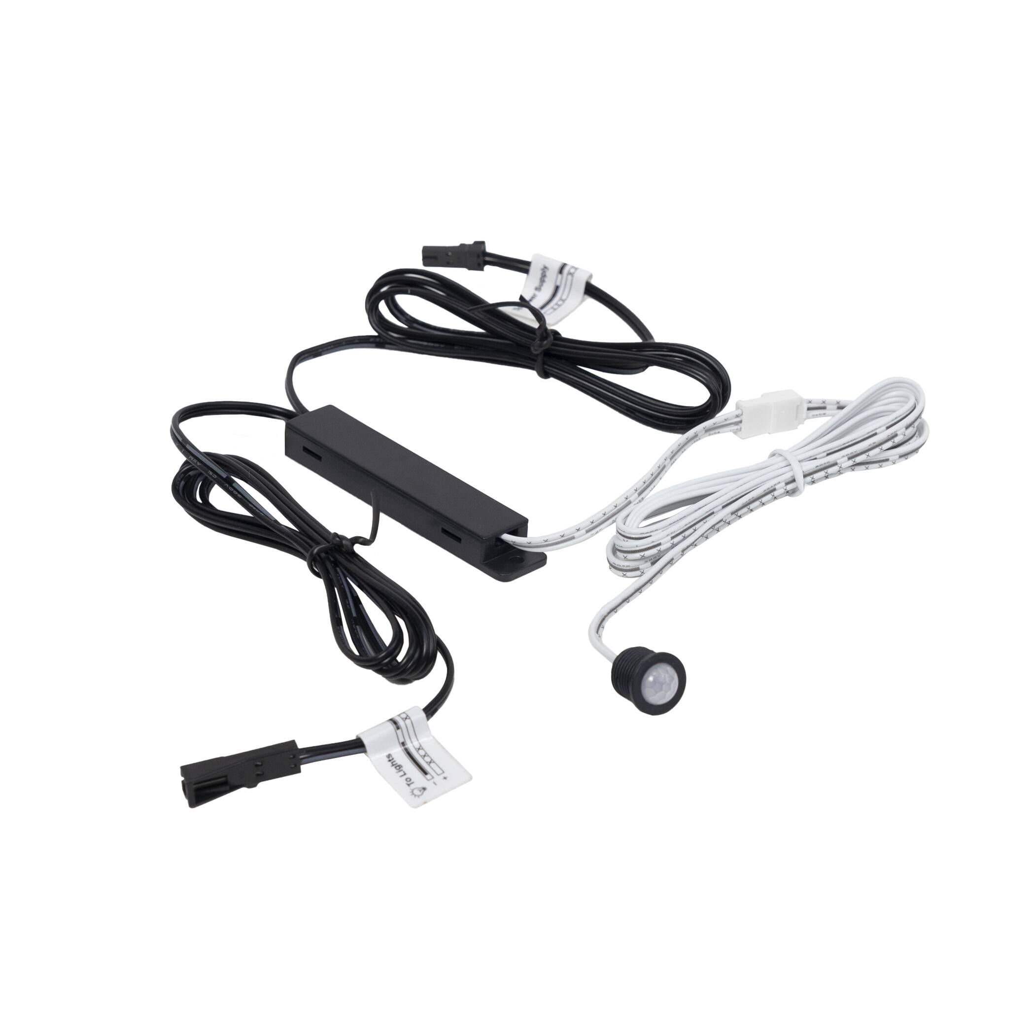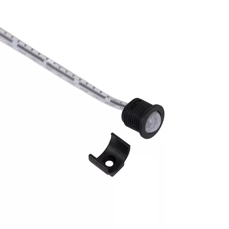 Датчик движения с креплением, срабатывает на движение, расстояние до 3м, рабочее напряжение 12- 24VDC, мощность 60W, степень защиты IP20, способ установки врезной или накладной, размер установочного отверстия 12мм, длина провода до блока управления 1 м, длина проводов от блока управления до источника света и блока питания по 100 см, угол срабатывания до 120 градусов. Автоматически выключает питание при отсутствии движения более, чем 30 сек. Цвет выключателя: черный.