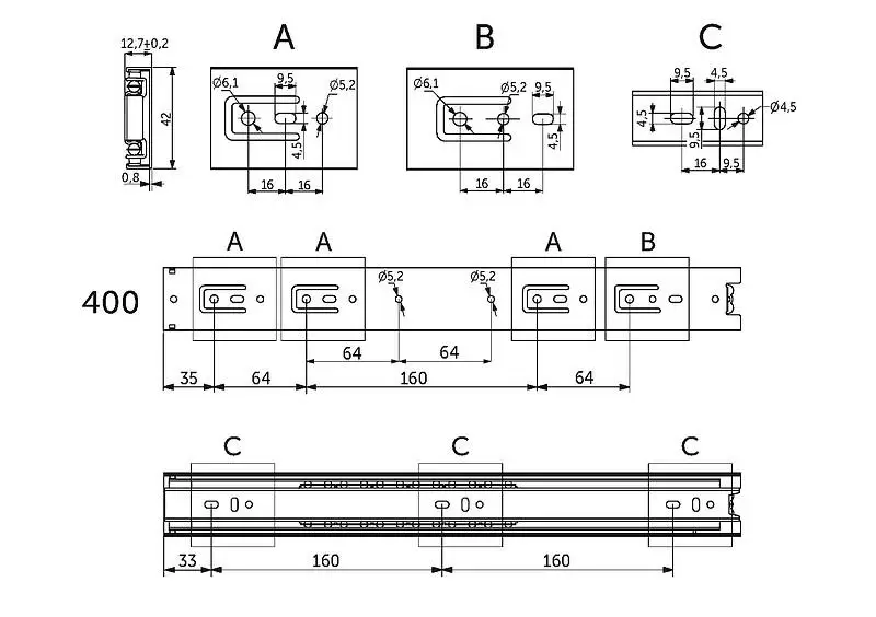 Направляющая для мебели GRIDLI изготовлена из холоднокатаной стали толщиной 0,80*0,80*0,80 мм, имеет резиновый фиксатор от самопроизвольного открытия. Фактическая высота данной направляющей 42,5 мм, а её длина – 400 мм.