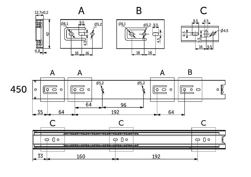 Направляющая для мебели GRIDLI изготовлена из холоднокатаной стали толщиной 0,80*0,80*0,80 мм, имеет резиновый фиксатор от самопроизвольного открытия. Фактическая высота данной направляющей 42,5 мм, а её длина – 450 мм.