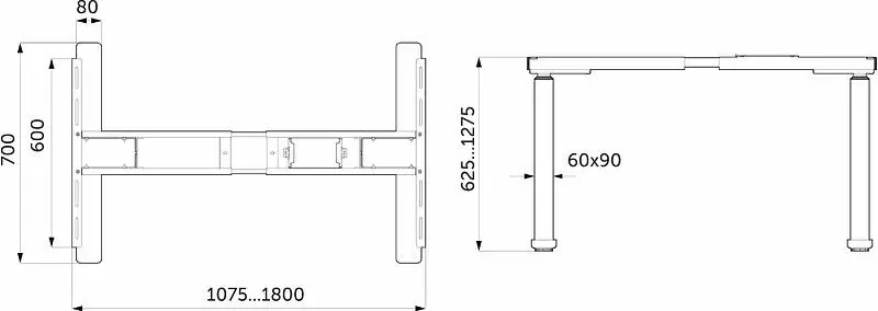 Регулировка высоты подстолья от 625 до 1275 мм, регулировка ширины от 1075 до 1800 мм (память высоты в 3-х положениях). В подстолье встроено 2 разъема USB (USB type A + USB type C), 2 двигателя, гарантирующие стабильную работу опор. Входная мощность 110-230 V, максимальная скорость 40 мм/сек. Нагрузка до 120 кг. Протестировано на 80 000 рабочих циклов.