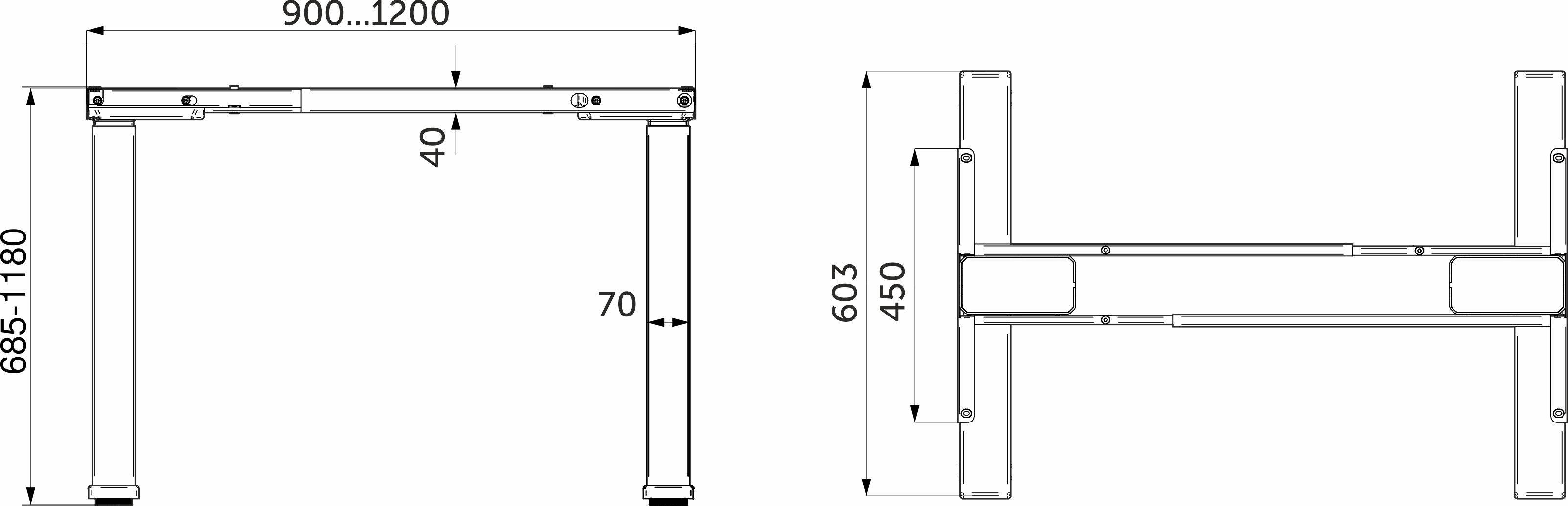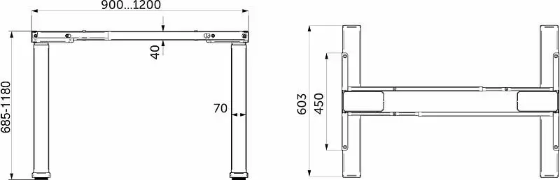 Регулировка высоты подстолья от 685 до 1180 мм, регулировка ширины от 900 до 1200 мм (память высоты в 3-х положениях.