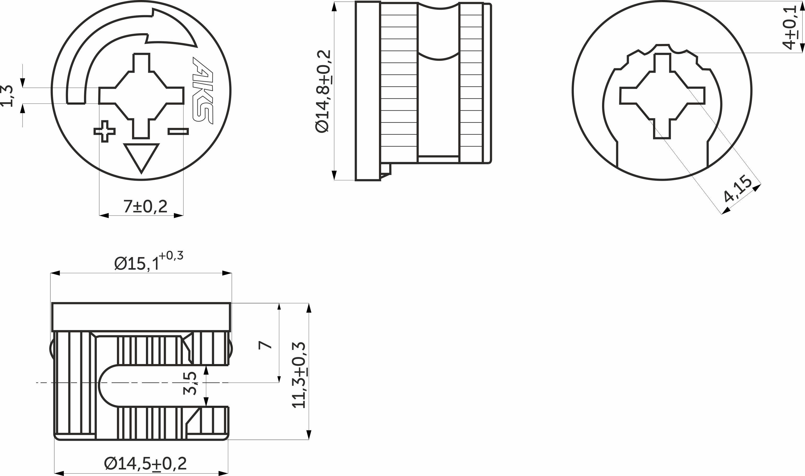 Выполнен из оцинкованной стали и рассчитан для плит толщиной от 16 мм. В тандеме со штоком создаёт очень прочное крепление деталей. Стальной эксцентрик имеет вес 7,0-7,1 грамма и тяжелее стандартного эксцентрика из цинка в 2 раза, что в совокупности с измененной геометрией самого эксцентрика приводит к деформации только при усилии на скручивание от 12,0-14,5 N.m. (стандартный цинковый эксцентрик, например, рассчитан на усилие всего в 6,0-8,0 N.m.).