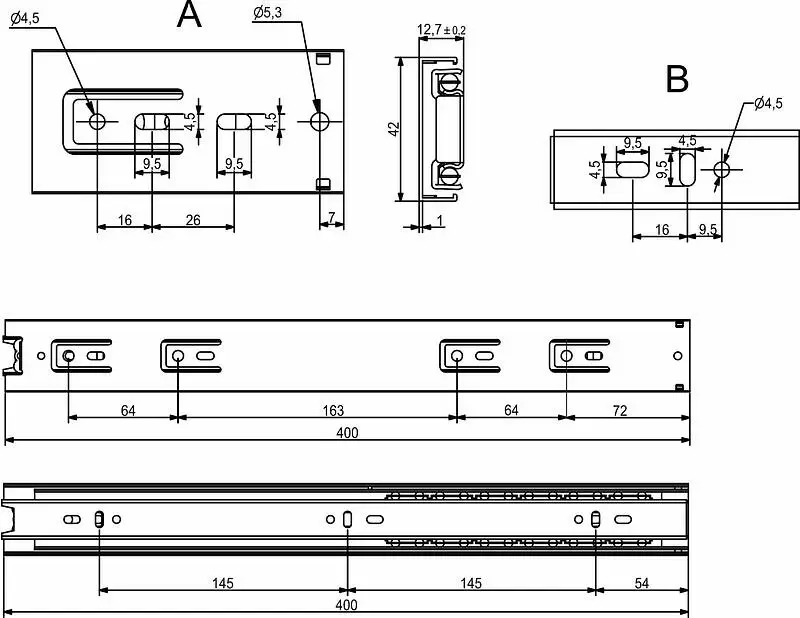 Направляющая для мебели GRIDLI изготовлена из холоднокатаной стали толщиной 0,80*0,80*0,80 мм, имеет резиновый фиксатор от самопроизвольного открытия. Фактическая высота данной направляющей 42,5 мм, а её длина – 400 мм.