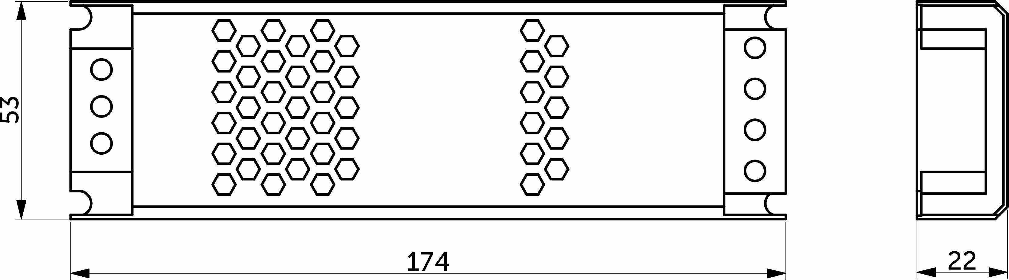 Размеры 174х53х22 мм, вх.напряж. 176-220V AC, вых.напряж. 12V DC, мощность 36Вт, сила тока 3A, степень защиты IP20. Имеет современный дизайн, более узкий, по сравнению с обычным Indoor. Есть дополнительные зажимные клеммы.