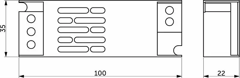Размеры 100х35х22 мм, Вх.напряж. 176-264V AC, вых напряж. 12V DC, мощность 30Вт, сила тока 2,5A, степень защиты IP20.