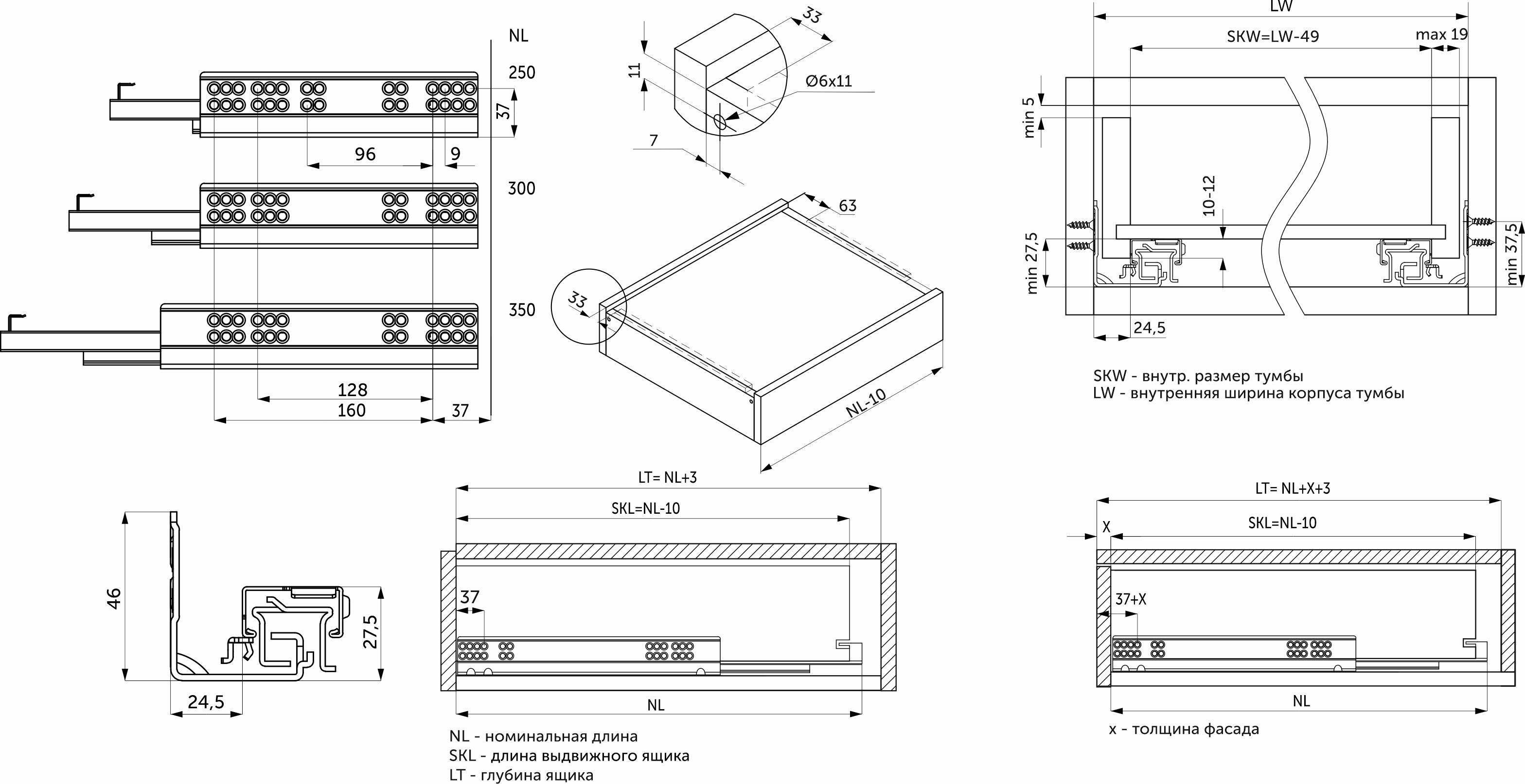 Направляющая скрытого монтажа L-350 с доводчиком ДСП до19mm с замками PRIME by AKS 3D полное выдвижение
