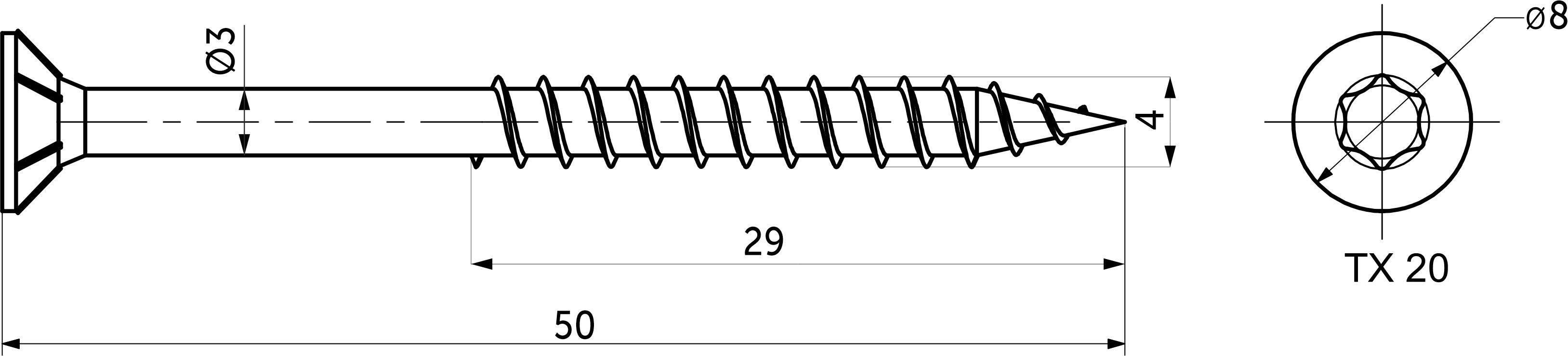 Максимальная прочность соединения Шлиц TORX (звездочка) TX20 обеспечивает надежный контакт инструмента с головкой шурупа, что гарантирует высокую передачу крутящего момента. В отличие от обычных крестовых шлицев, TORX снижает риск срыва границ шлица и повышает долговечность инструмента и крепежа.