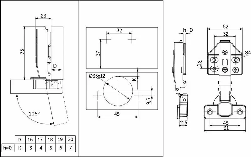 Данная петля подходит для фасадов толщиной до 22мм, имеет межцентровое расстояние между отверстиями в чашке в 45мм, а также высоту монтажной планки h0.