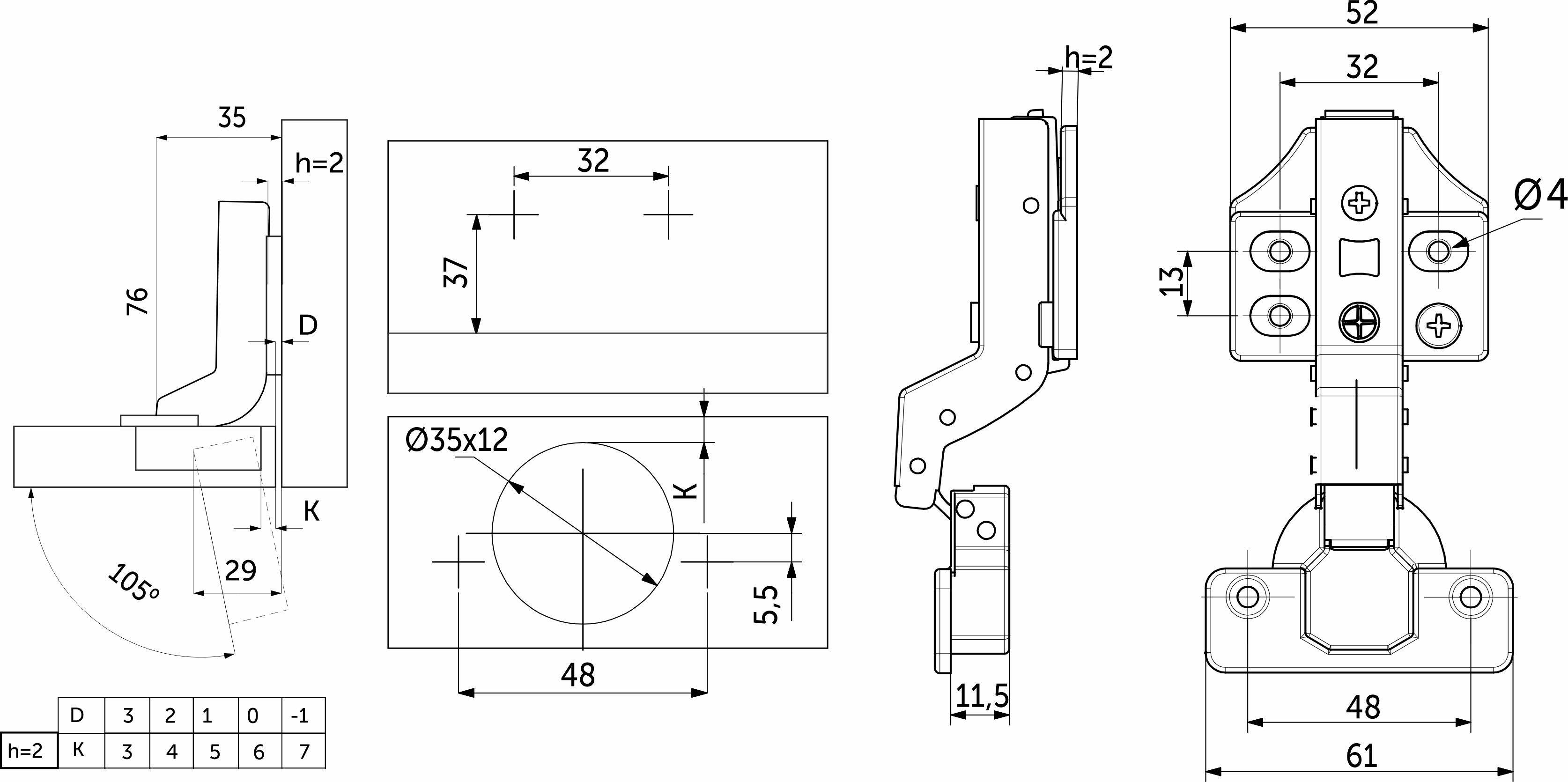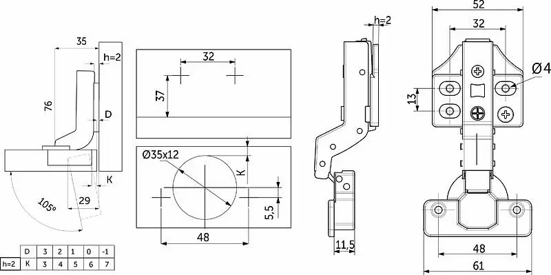 Данная петля подходит для фасадов толщиной до 22мм, имеет межцентровое расстояние между отверстиями в чашке в 48мм, а также высоту монтажной планки h2.