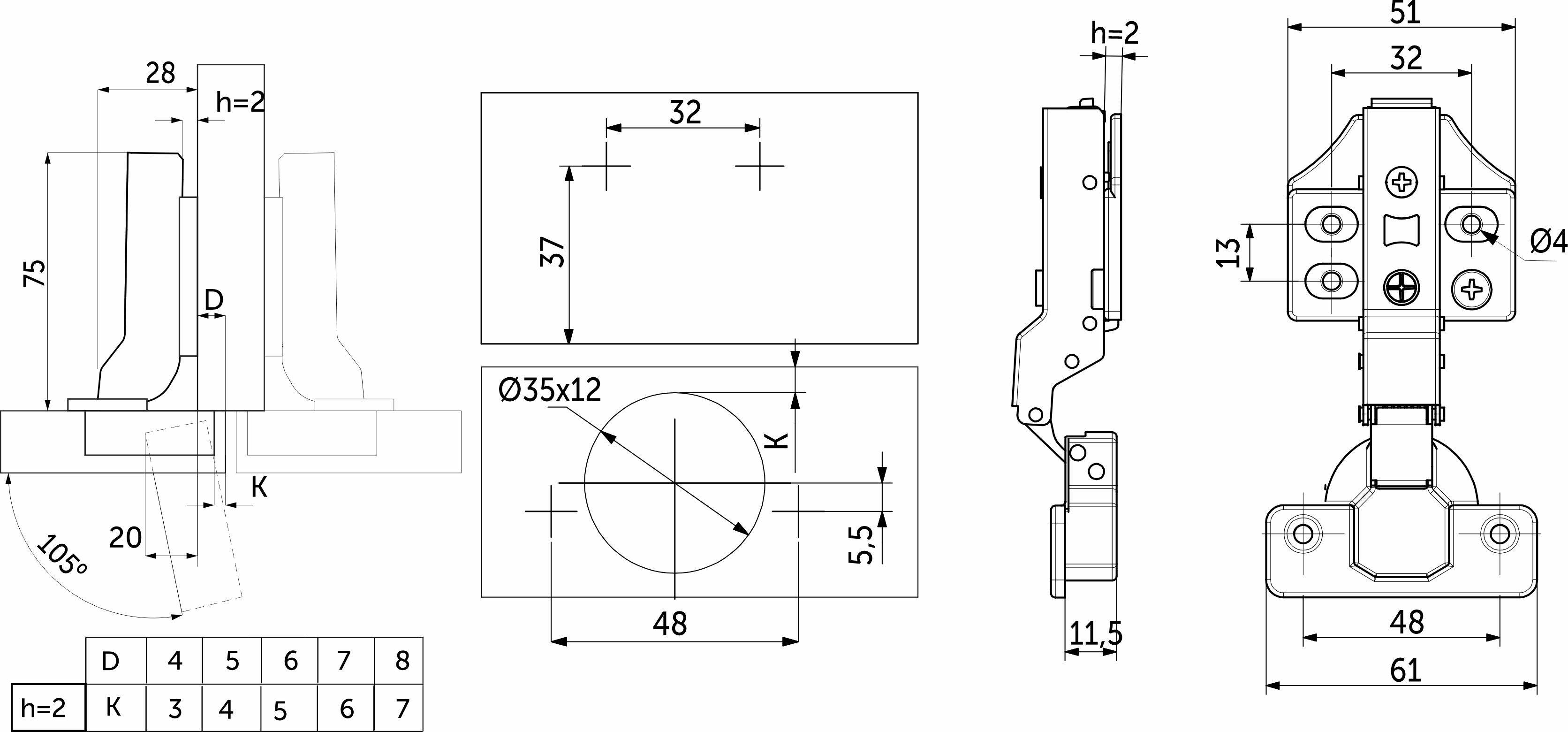 Данная петля подходит для фасадов толщиной до 22мм, имеет межцентровое расстояние между отверстиями в чашке в 48мм, а также высоту монтажной планки h2.