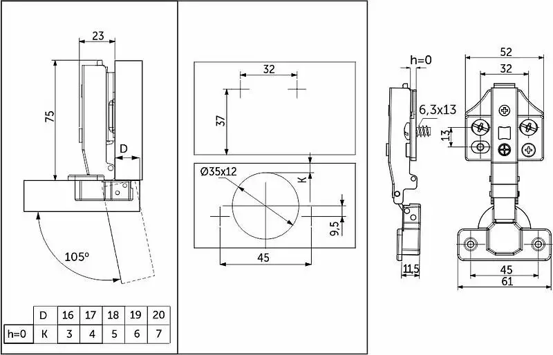 Данная петля подходит для фасадов толщиной до 22мм, имеет межцентровое расстояние между отверстиями в чашке в 45мм, а также высоту монтажной планки h0.