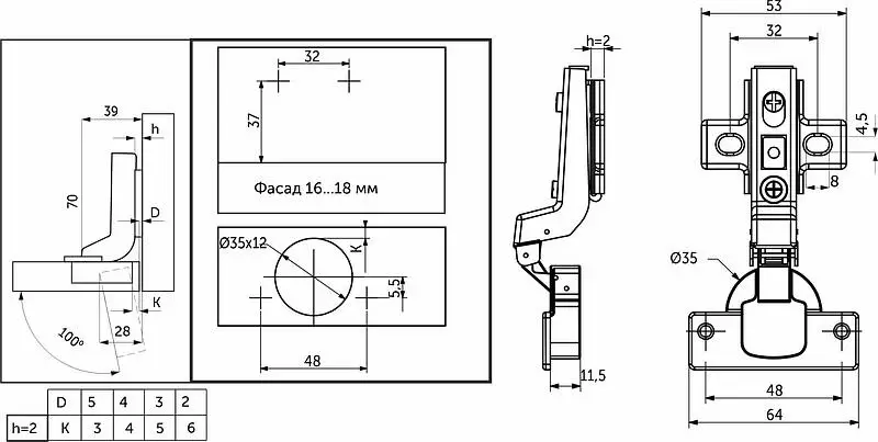 Петля предназначена для фасадов толщиной от 15 до 22 мм, имеет межцентровое расстояние между отверстиями в чашке в 48мм, а также высоту монтажной планки h2.
