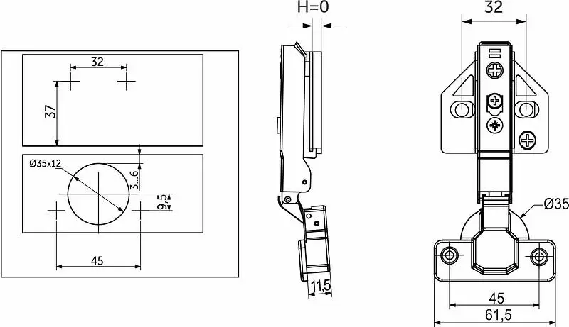 Петля мебельная накладная с доводчиком и системой быстрого монтажа clip on. Имеет современную систему регулировки в трех плоскостях по +4 мм при помощи эксцентриковых винтов в планке и теле петли.