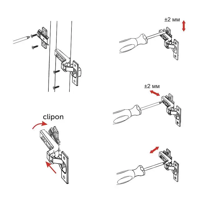 Петля регулируется в трех плоскостях винтами и позиционированием крепления планки петли к корпусу.