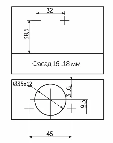 Тип внутренней петли предназначен для подъемных механизмов с функцией фиксации в положении, а также для установки фасадов с системами tip on. Чашка 35 мм.