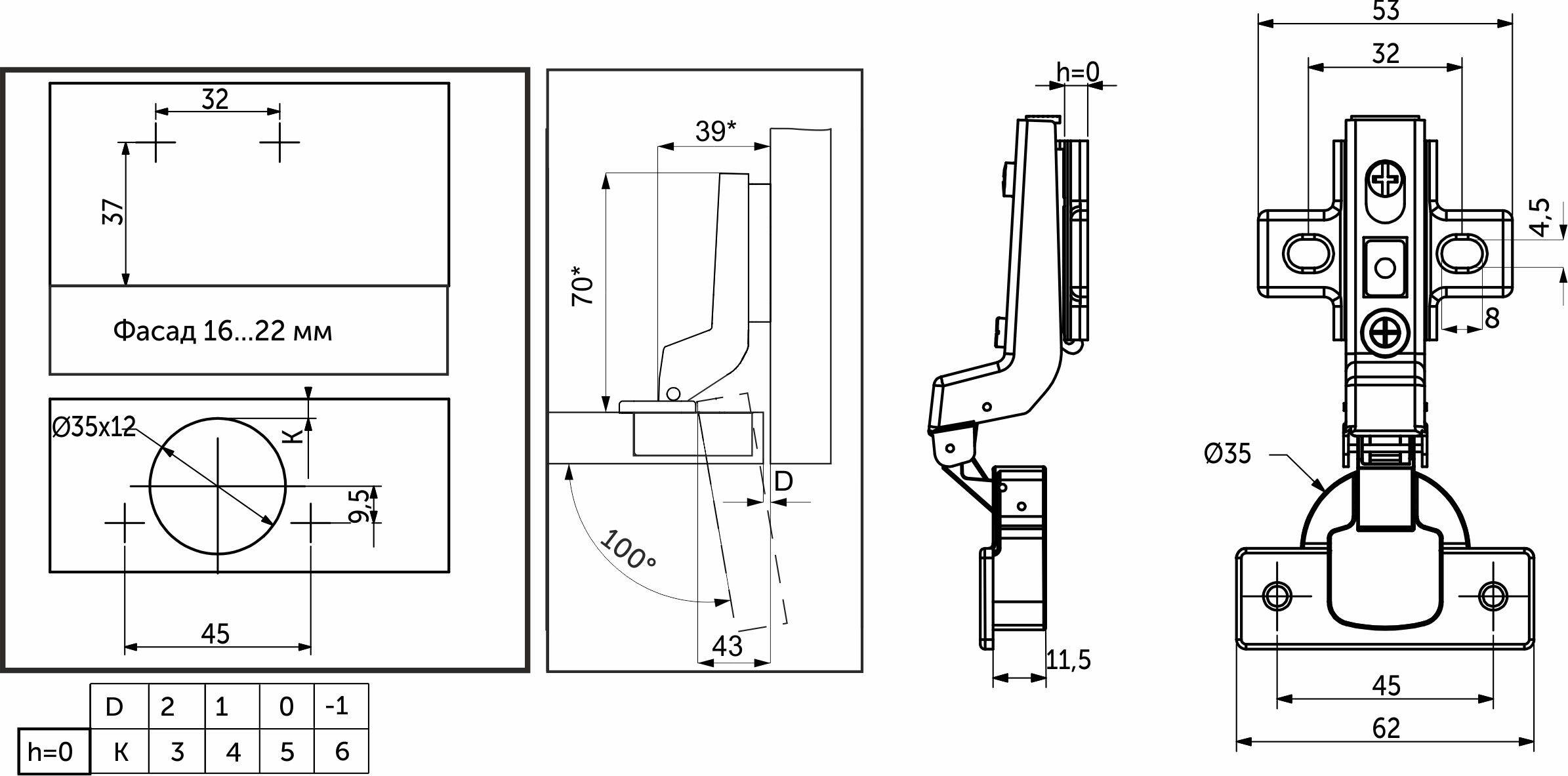 Тип внутренней петли предназначен для подъемных механизмов с функцией фиксации в положении, а также для установки фасадов с системами tip on. Чашка 35 мм.