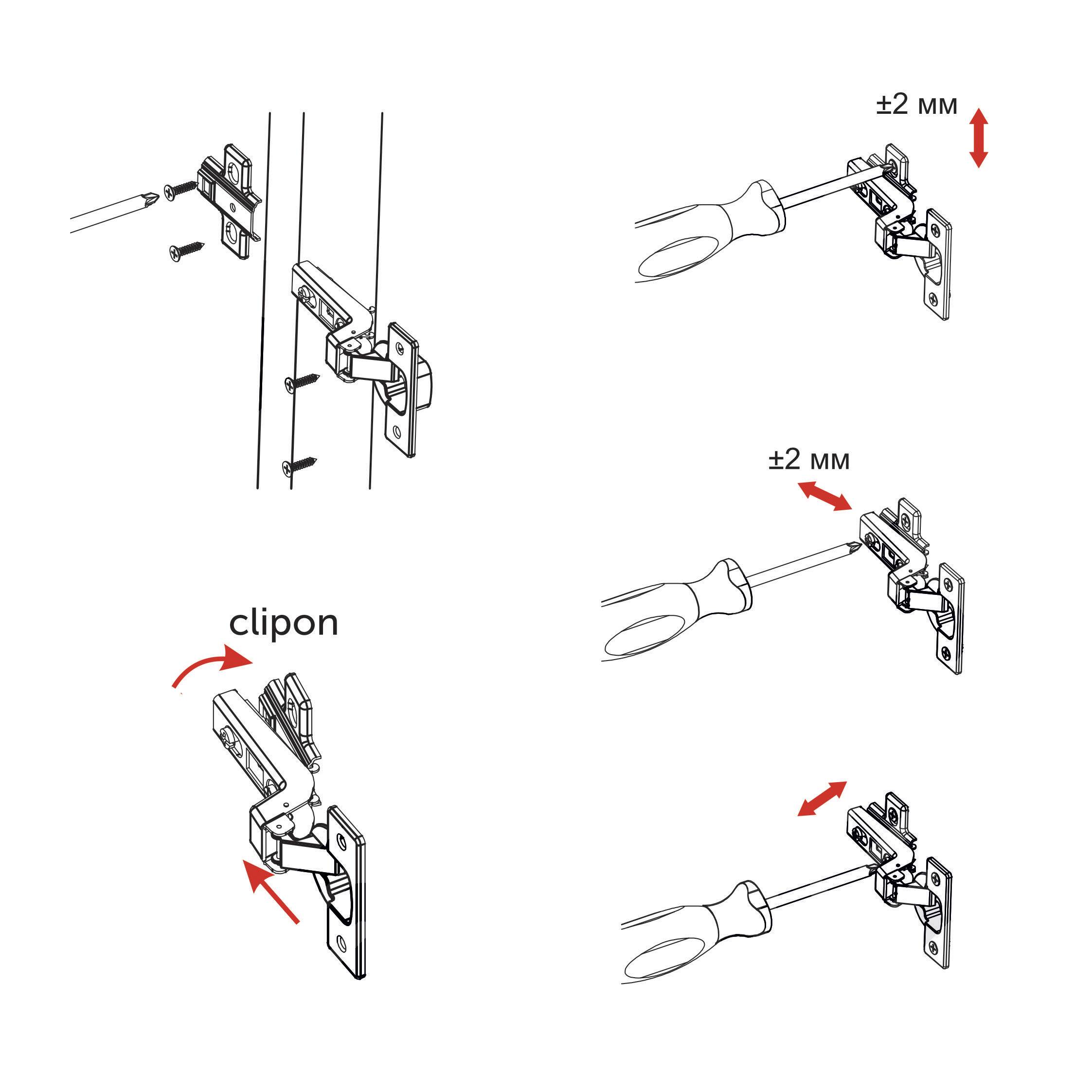 Петля регулируется в трех плоскостях винтами и позиционированием крепления планки петли к корпусу.