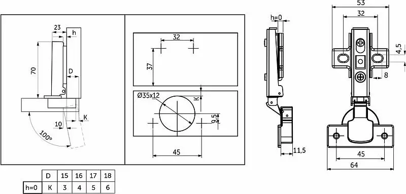 Петля предназначена для фасадов толщиной от 15 до 22 мм, имеет межцентровое расстояние между отверстиями в чашке в 45мм, а также высоту монтажной планки h0.