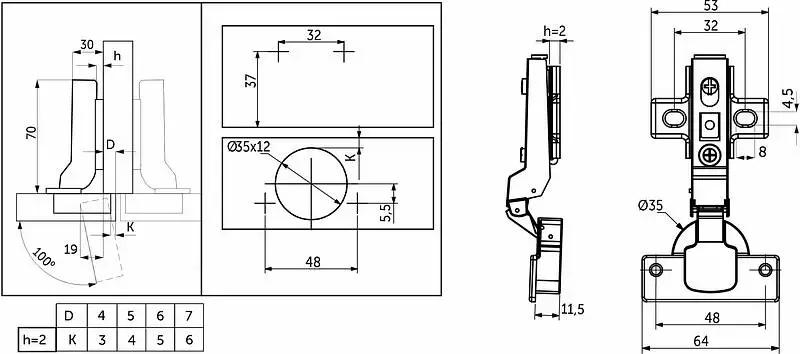 Петля предназначена для фасадов толщиной от 15 до 22 мм, имеет межцентровое расстояние между отверстиями в чашке в 48мм, а также высоту монтажной планки h2.