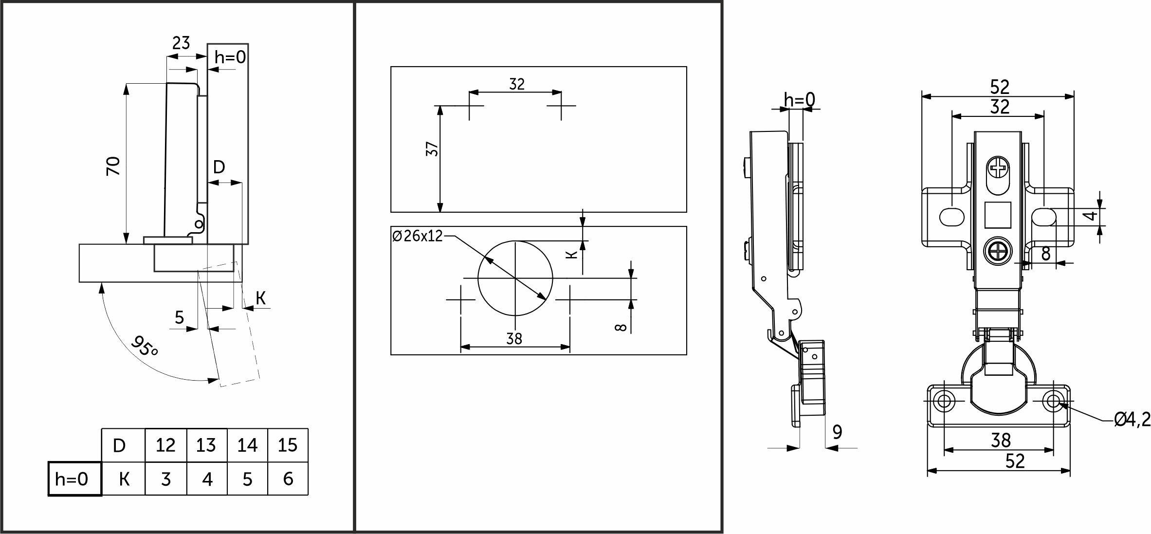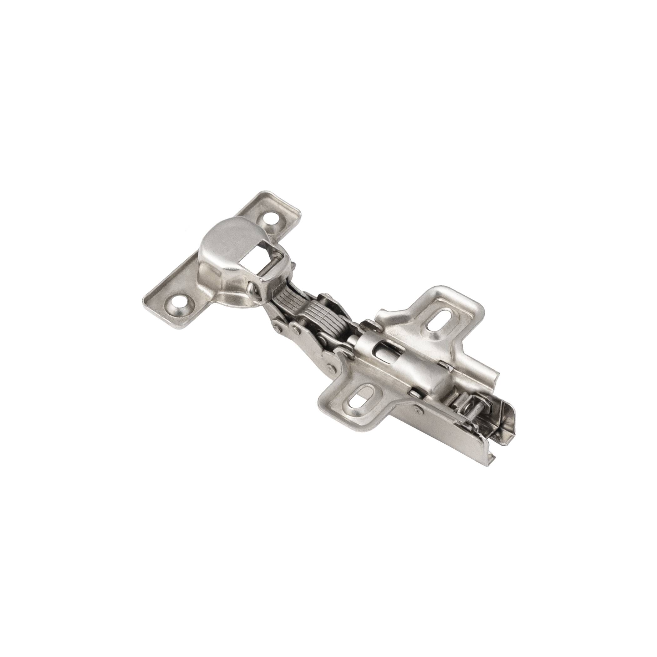 Компактная мини-петля с диаметром чашки 26мм, и доводчиком обеспечивает плавное и бесшумное закрывание ящиков. Подходит для накладных облегченных фасадов. Высота ответной планки H= 0 мм. Межцентровое расстояние крепления чашки - 38 мм. Крепление с помощью саморезов. Несъемная планка.
