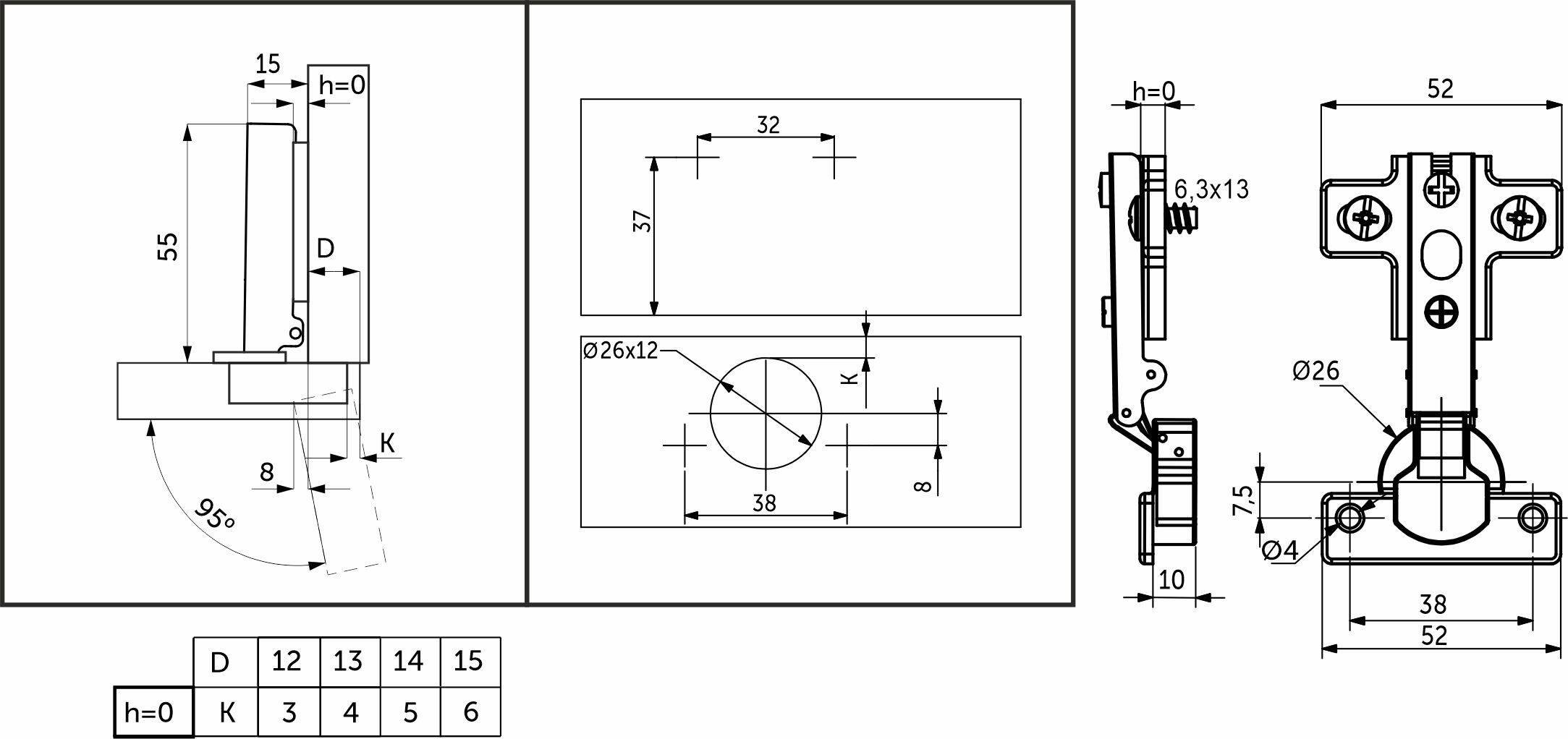 Высота ответной планки H= 0 мм. Межцентровое расстояние крепления чашки - 38 мм.