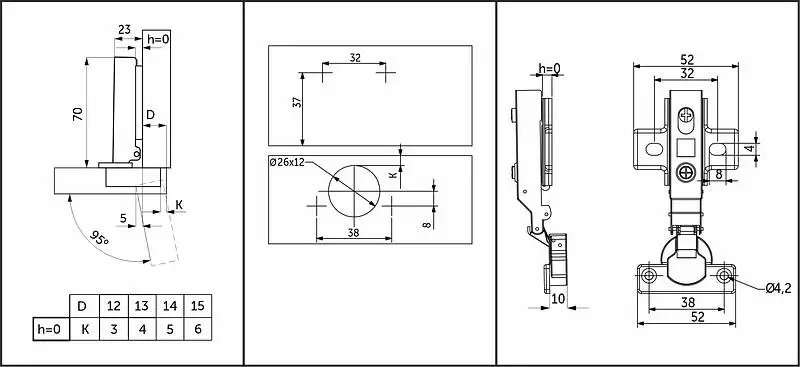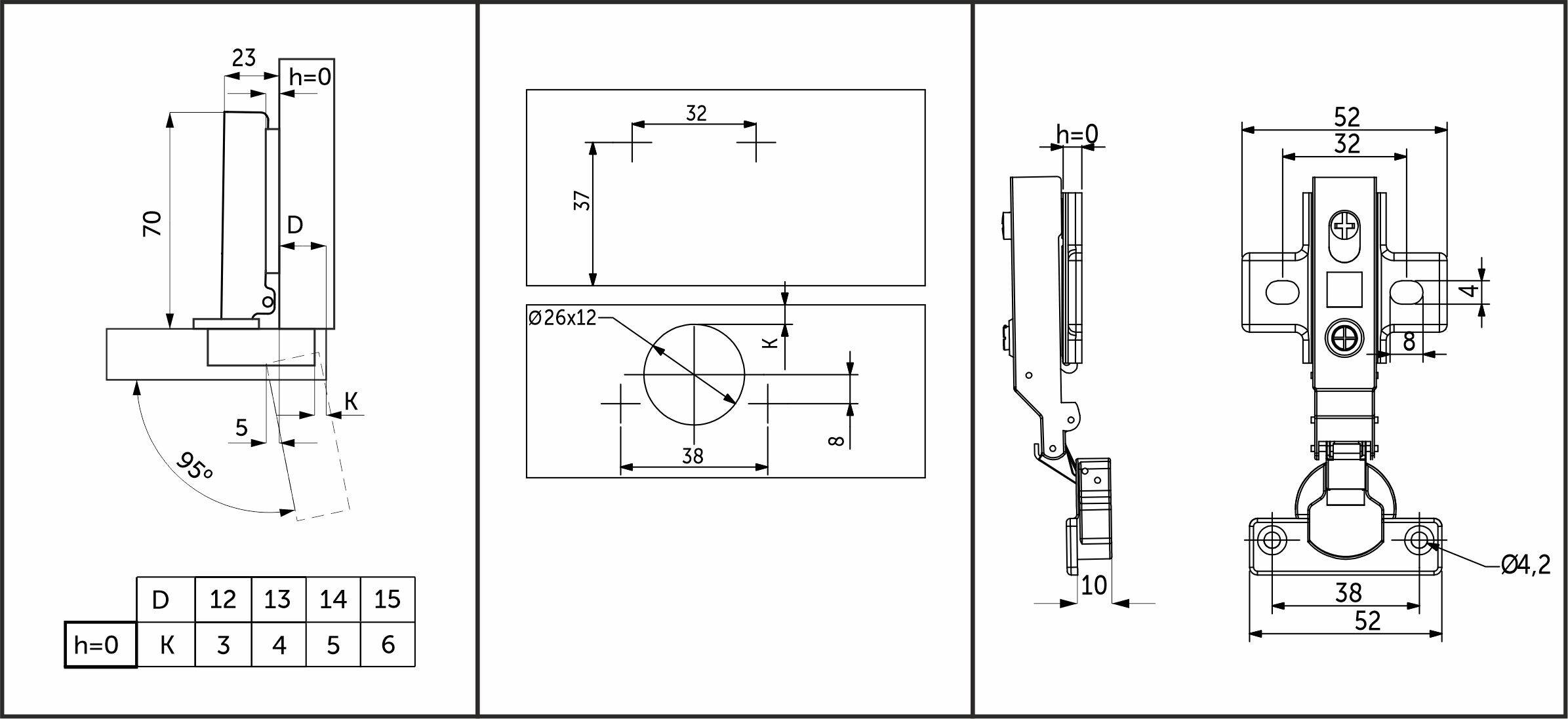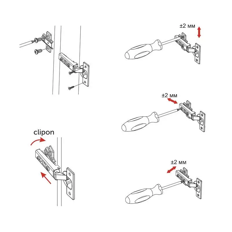 Петля мини накладная с доводчиком выполнена из холоднокатаной стали. Чашка 26 мм. Имеет механизм быстрого монтажа clip on и регулировочный винт с размером по резьбе в 10 мм. Высота ответной планки H=0 мм. Петля накладная мини предназначена для установки на фасад с перекрытием всех стенок корпуса примыкания к фасаду.