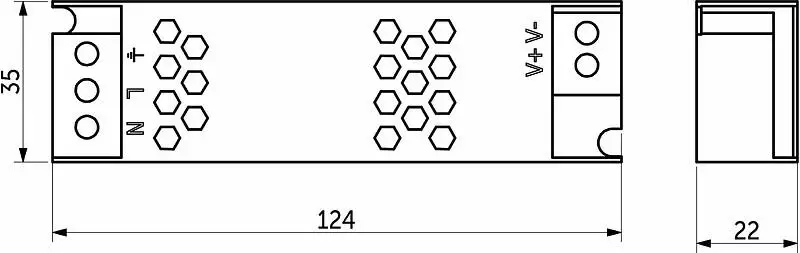 Размеры 124х35х22мм. Вх.напряж. 110-220V AC, вых напряж. 24V DC, мощность 36Вт, сила тока 1,5A, степень защиты IP20. Простой и компактный блок питания.