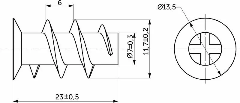 Пластиковый дюбель DRIVA применяется для крепления в гипсокартоне, газобетоне, штукатурке. Предварительное засверливание сверлом D 8мм. Монтаж происходит посредством вворачивания. Шуруп толщиной 4-4,5 мм, длина шурупа 23+L, где L – толщина прикрепляемой поверхности либо величина вылета шурупа над поверхностью.