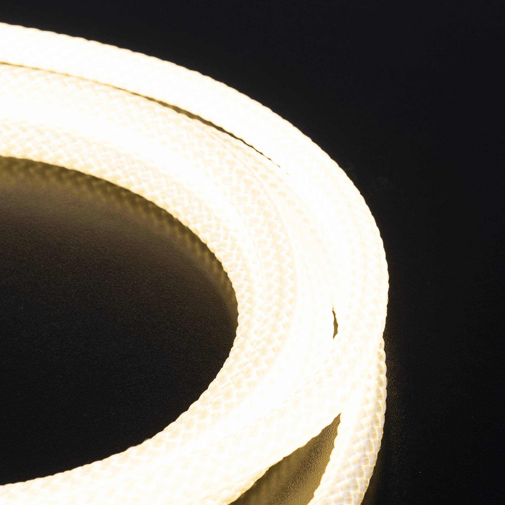 Декоративная светодиодная веревка, мощность 15w/m, напряжение 24V, 120 диодов на метр, диаметр 16мм, степень защиты IP65, длина 5 метров, теплый белый (3000K), шаг резки диодов - 6 штук. Благодаря различным креплениям можно устанавливать на любой вид поверхности.