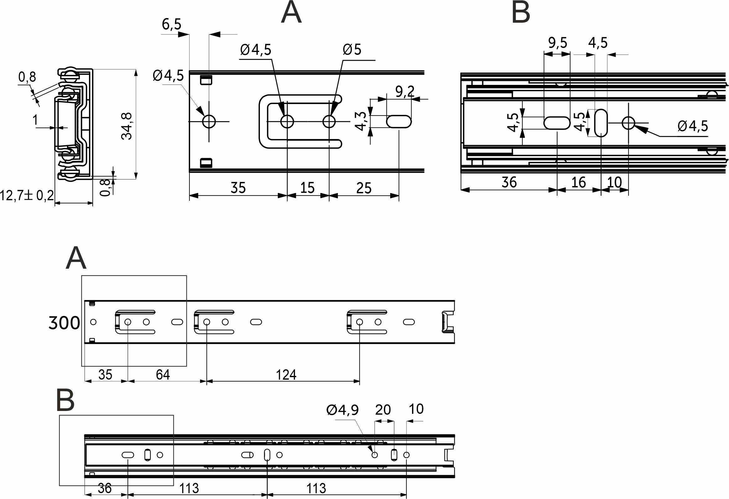 Направляющая для мебели AKS изготовлена из холоднокатаной стали толщиной 0,7*0,7*0,7 мм, имеет резиновый фиксатор от самопроизвольного открытия. Фактическая высота данной направляющей 35 мм, а её длина – 300 мм.