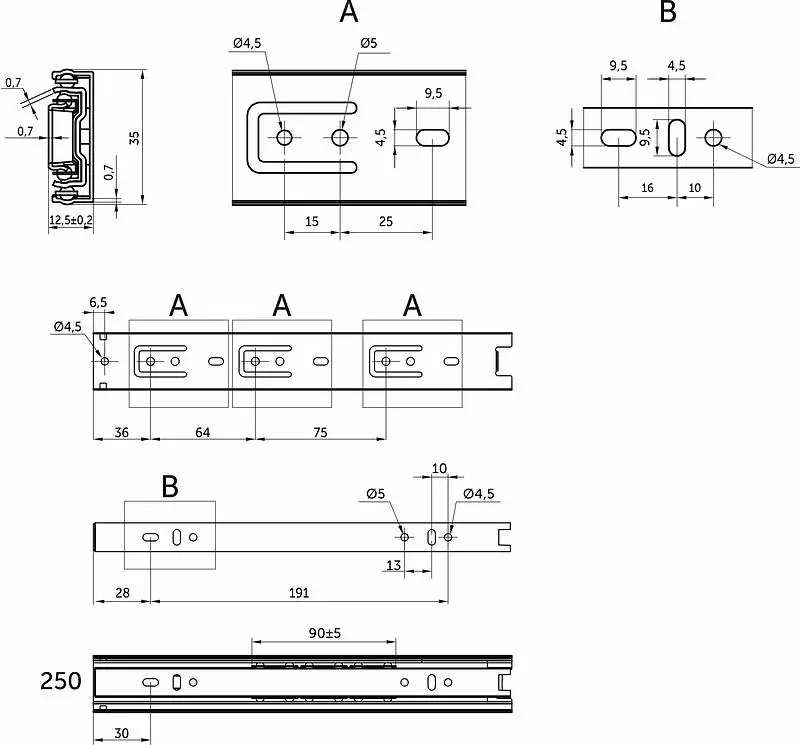 Направляющая для мебели AKS изготовлена из холоднокатаной стали толщиной 0,7*0,7*0,7 мм, имеет резиновый фиксатор от самопроизвольного открытия. Фактическая высота данной направляющей 35 мм, а её длина – 250 мм.