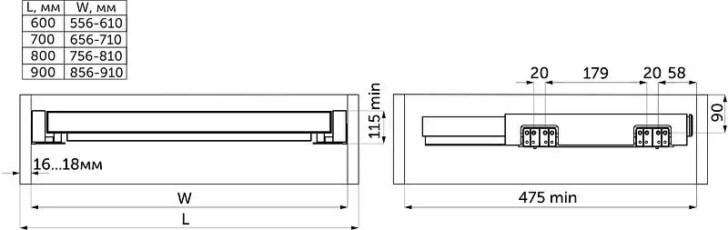 -направляющие: L-450 мм скрытого монтажа полного выдвижения с доводчиком (max нагрузка на направляющие - 25 кг);