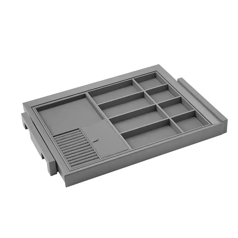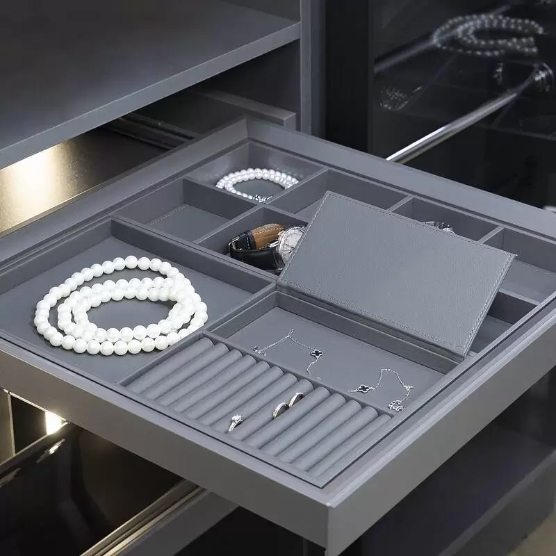 Современные лаконичные выдвижные полки для украшений и аксессуаров на направляющих скрытого монтажа с доводчиком на закрытие. Эргономичны, легко монтируются и регулируются. Для бижутерии, часов, галстуков, ремней, платков.