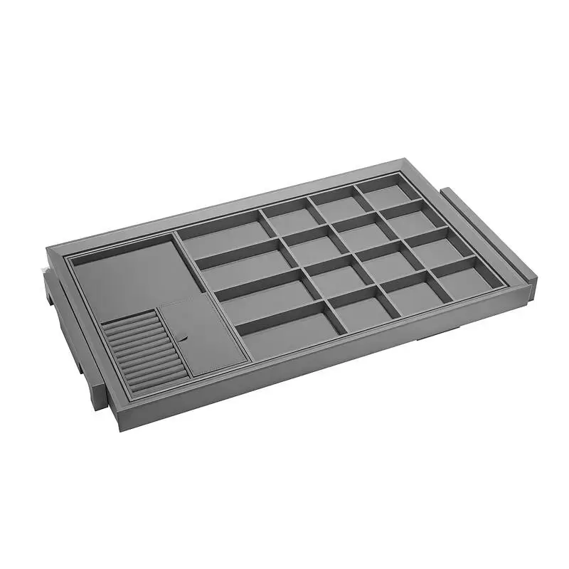 Современные лаконичные выдвижные полки для украшений и аксессуаров на направляющих скрытого монтажа с доводчиком на закрытие. Эргономичны, легко монтируются и регулируются. Для бижутерии, часов, галстуков, ремней, платков.