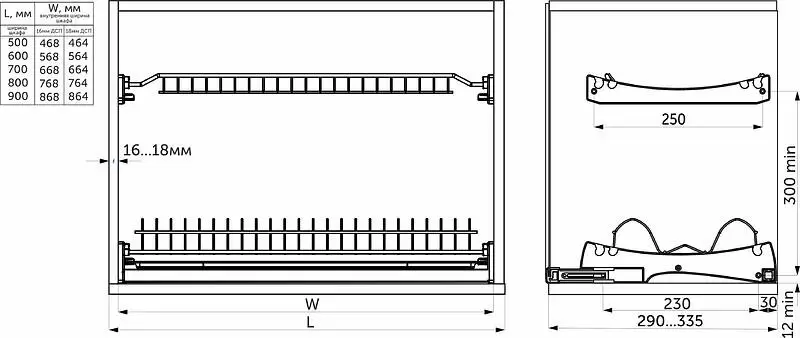 - подходит для установки в ящик как с ДСП 18 мм, так и с ДСП 16 мм.