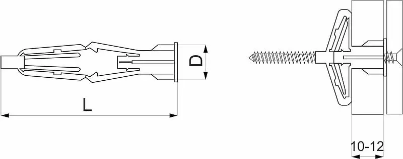 Дюбель-бабочка предназначен для крепление легконагруженных конструкций (деревянные направляющие, металлические полки и кронштейны, карнизы и элементы декора и пр.) к тонкостенным листовым основаниям.