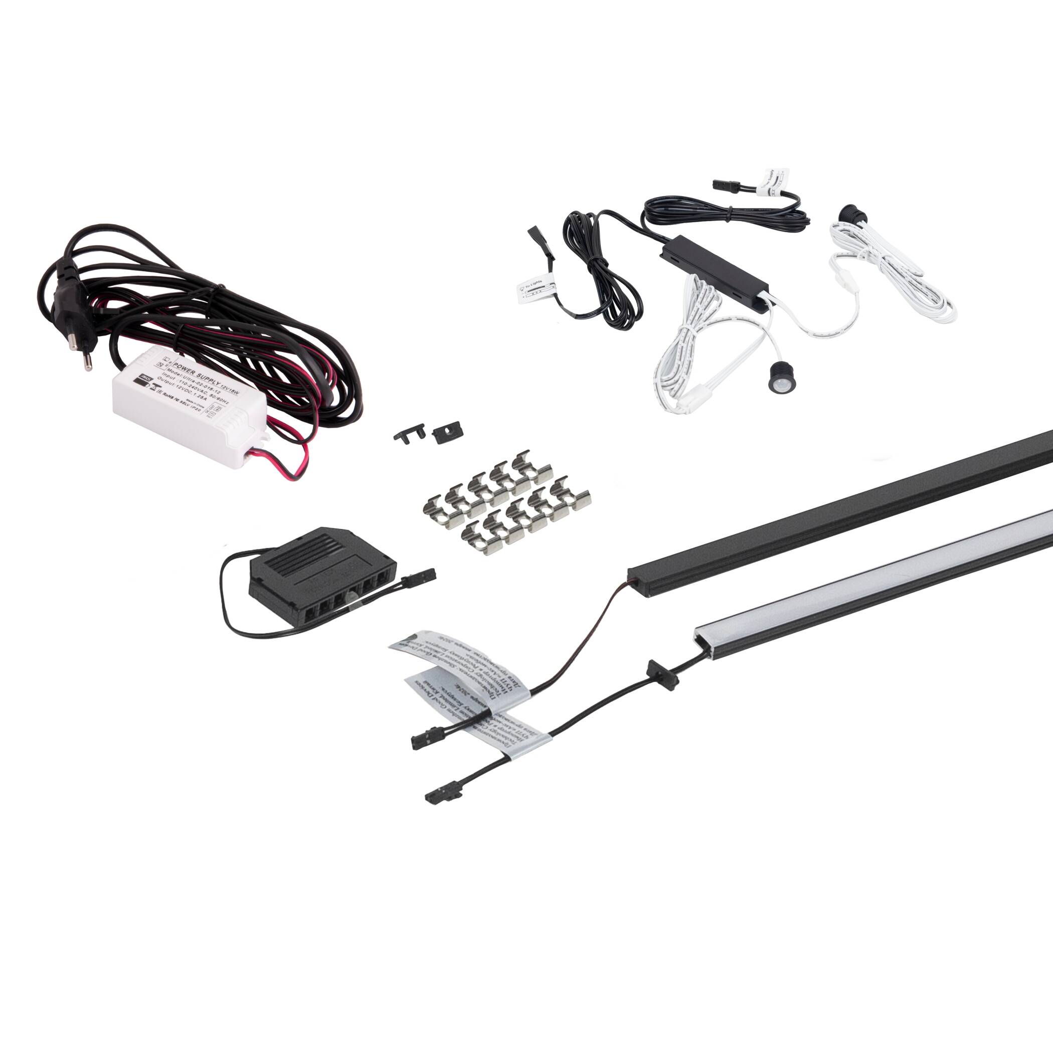 В комплект входит: два светодиодных светильника длиной 2м, выключатель на движение, разветвитель, блок питания со шнуром и вилкой, заглушки, крепления.