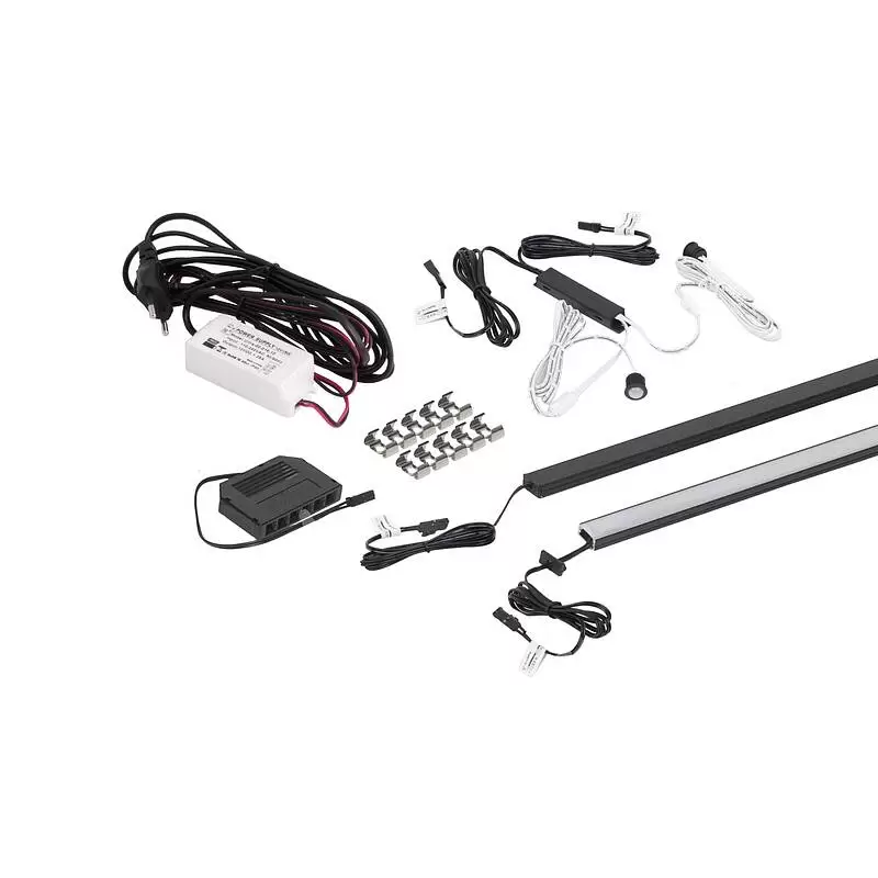 В комплект входит: два светодиодных светильника длиной 2м, выключатель на движение, разветвитель, блок питания со шнуром и вилкой, заглушки, крепления.