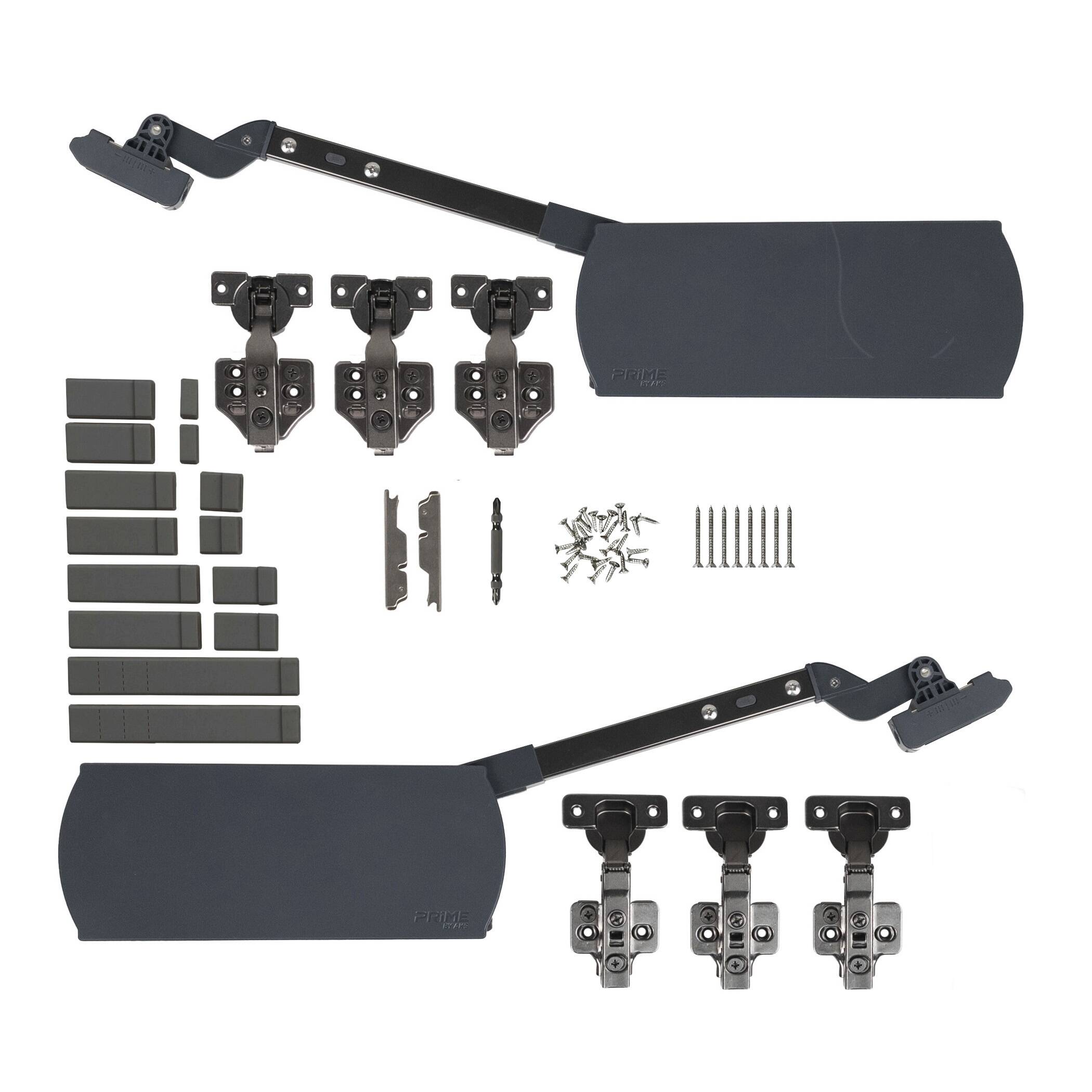 В комплект входят: подъемный механизм (2 шт.), пластиковые заглушки (2 шт.), крепление фасада (2 шт.), бита (1 шт.), верхняя петля (3 шт.), промежуточная петля для предотвращения защемления пальцев (3 шт.), саморезы 3,6х16 мм (37 шт.), саморез 4х40 мм (8 шт.), декоративные заглушки плеча, комплект шаблонов для установки, инструкция по установке.